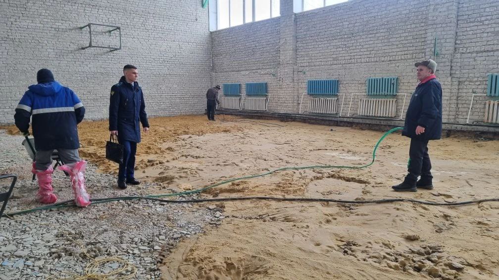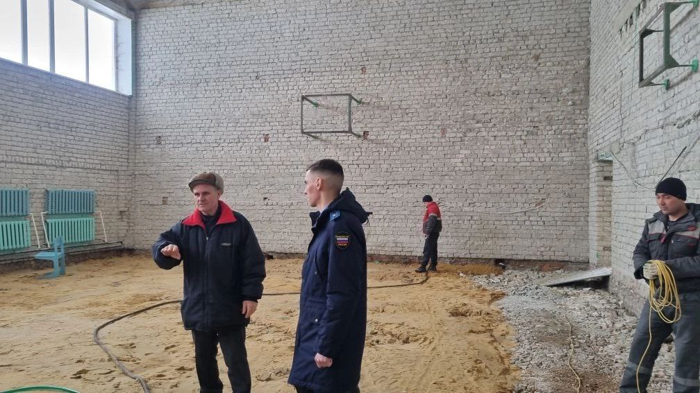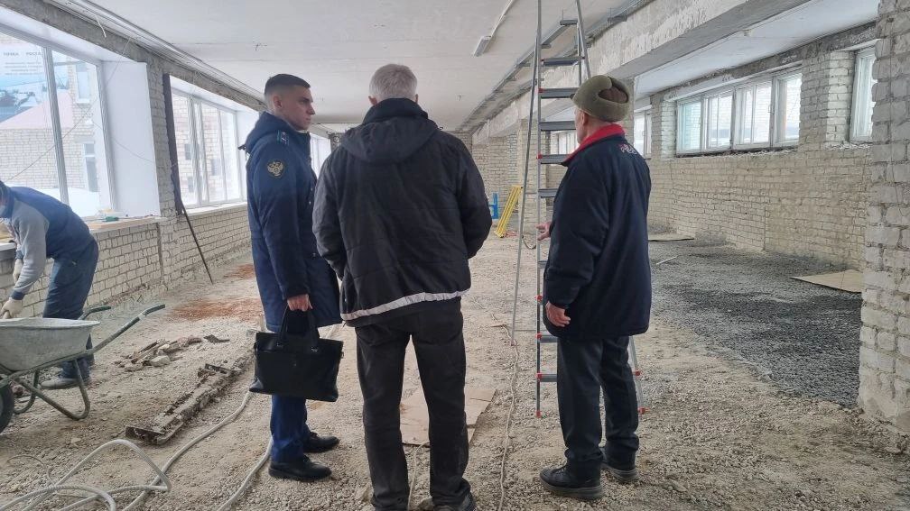В ходе выезда заместитель прокурора района Малкин И.Н. изучает ход капитального ремонта здания МБОУ "Вешкаймский лицей имени Б.П. Зиновьева при УлГТУ".