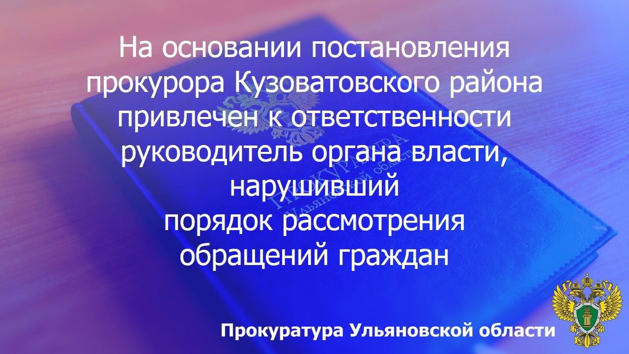 По результатам рассмотрения возбужденного прокурором Кузоватовского района Ульяновской области дела об административном правонарушении по ст. 5.59 КоАП РФ (нарушение порядка рассмотрения обращений граждан) глава администрации муниципального образования «Безводовское сельское поселение» привлечена к административной ответственности.