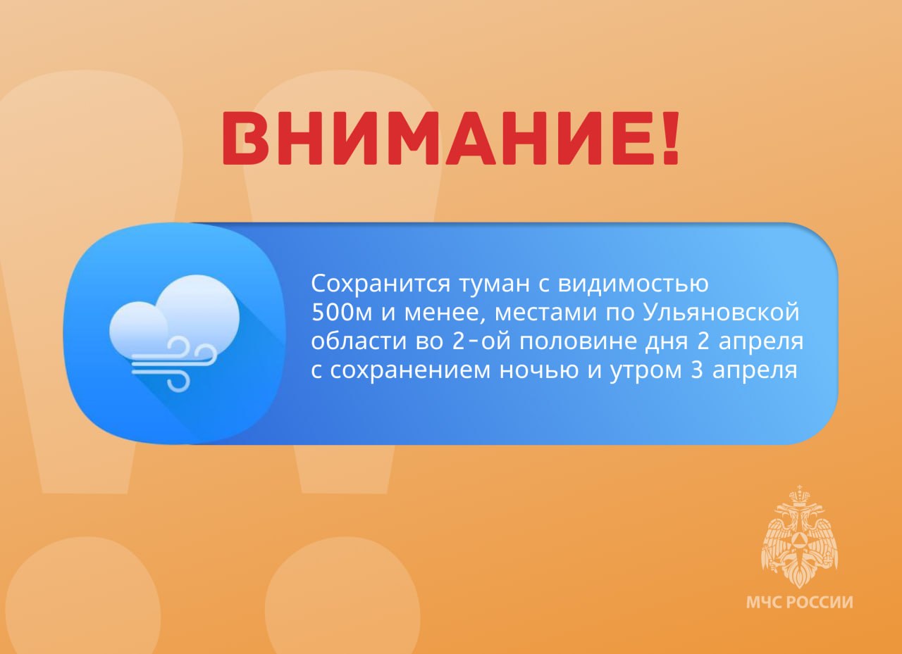 Сохранится туман с видимостью 500м и менее, местами по Ульяновской области во 2-ой половине дня 2 апреля с сохранением ночью и утром 3 апреля.