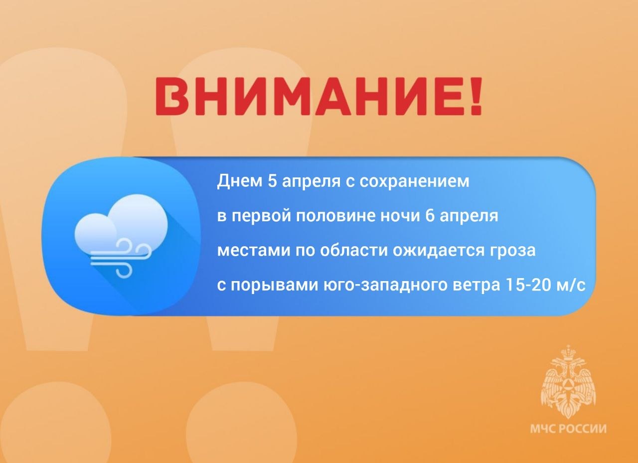 Днем 5 апреля с сохранением в первой половине ночи 6 апреля местами по области ожидается гроза с порывами юго-западного ветра 15-20 м/с.