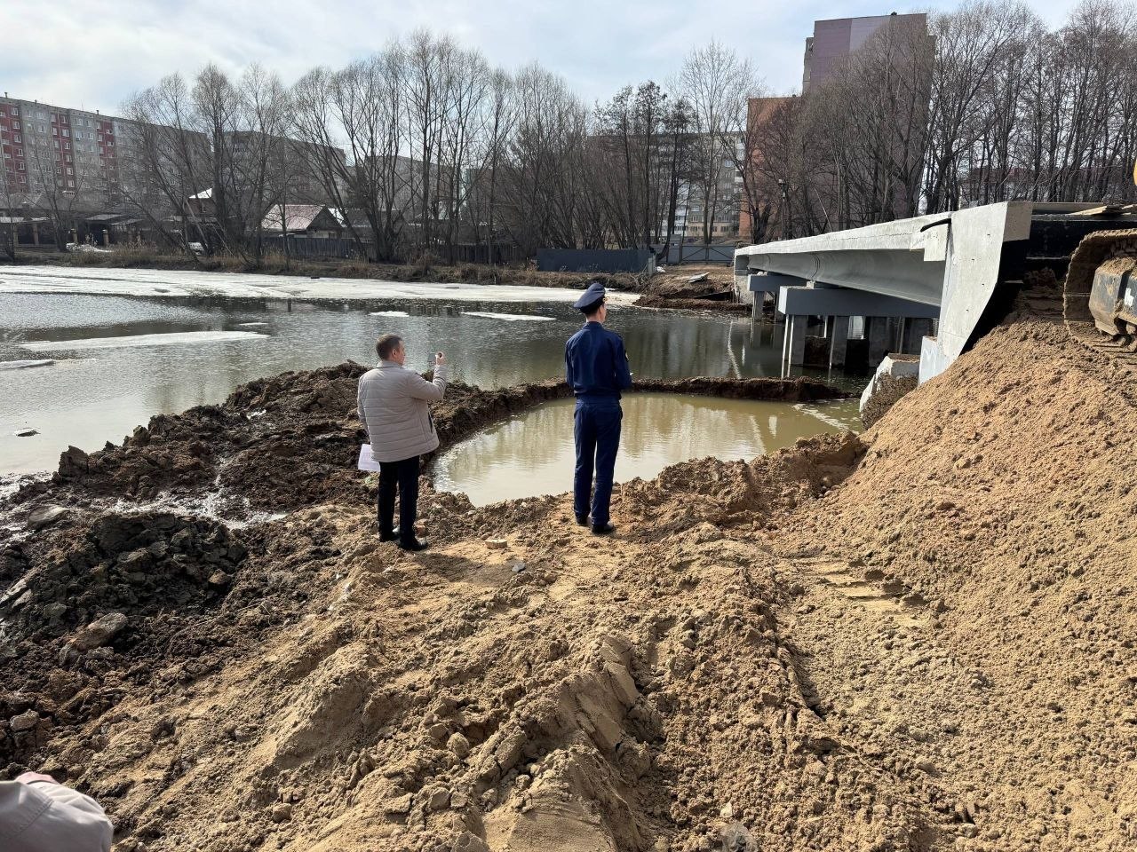 Помощник прокурора г. Димитровграда Никитин В.В. в ходе выезда на строительную площадку, где осуществляется возведение пешеходного моста через реку Мелекесс, изучает вопросы своевременности и качества проводимых работ на объекте.