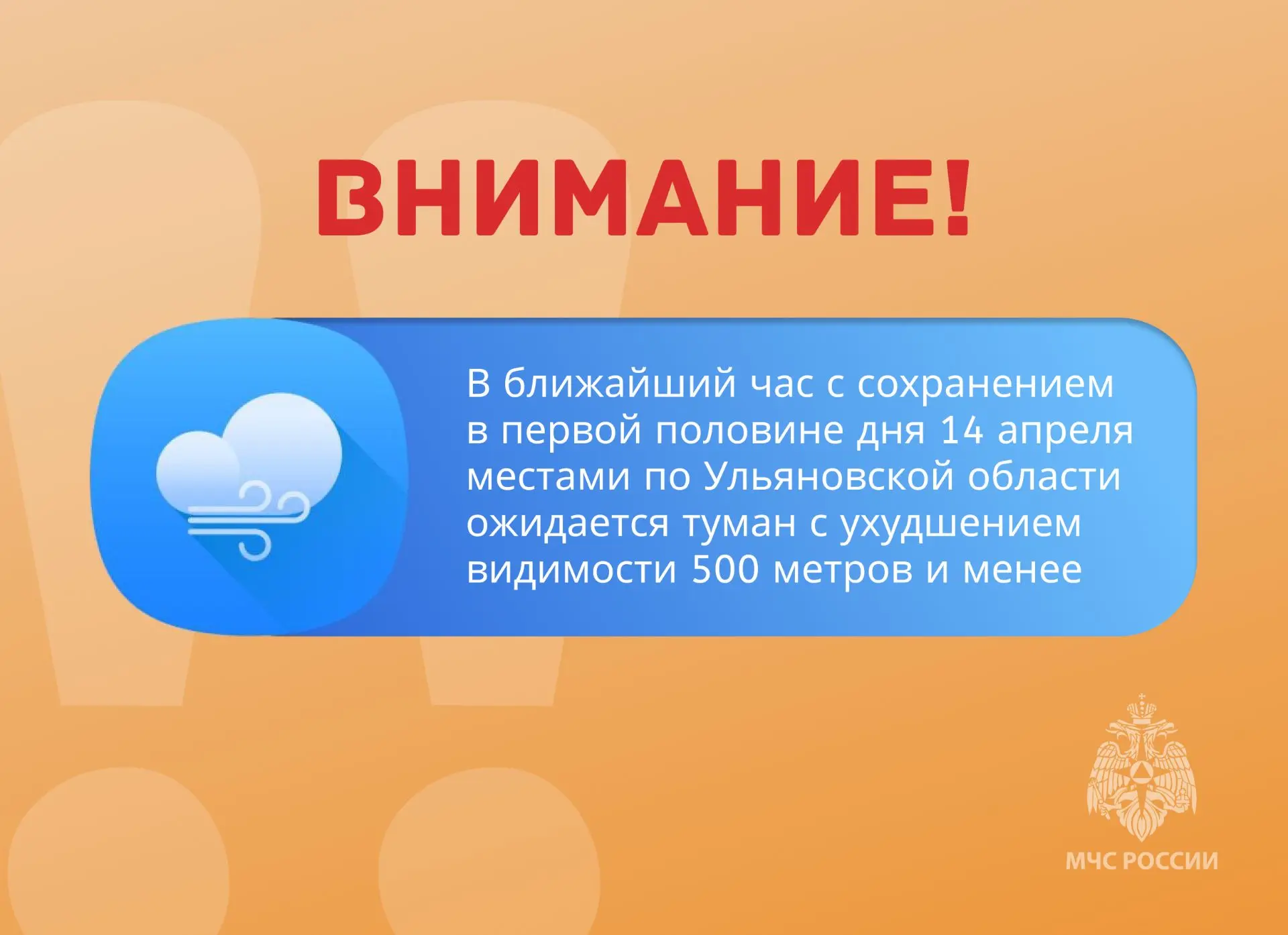 В ближайший час с сохранением в первой половине дня 14 апреля местами по Ульяновской области ожидается туман с ухудшением видимости 500 метров и менее.