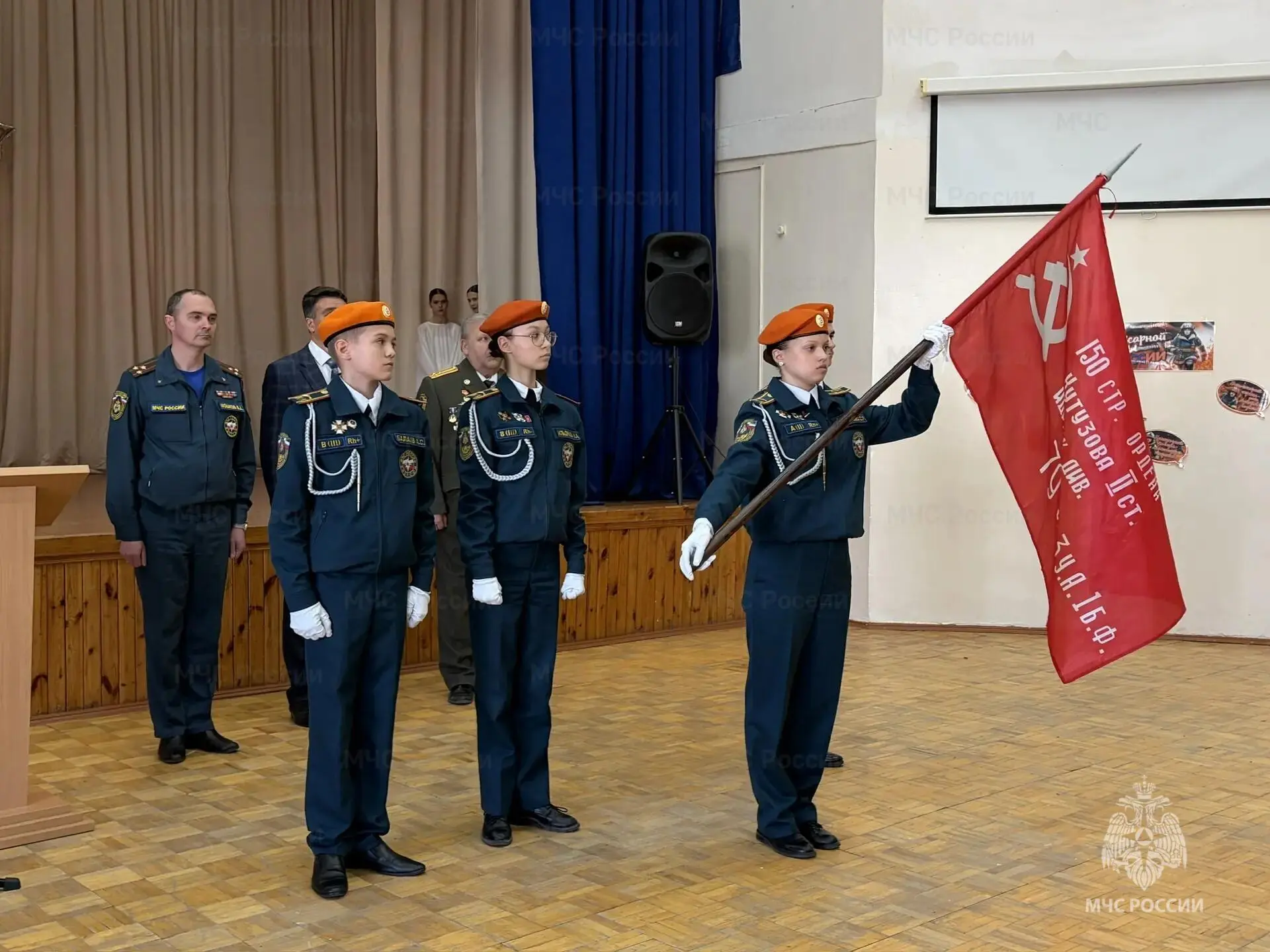 Под звуки военного марша знаменная группа Главного управления МЧС России по Ульяновской области внесла в актовый зал копию Знамени — одного из главных символов отваги и мужества нашего народа. Во время торжественной церемонии прозвучал гимн Российской Федерации. Память погибших во время Великой Отечественной войны почтили минутой молчания. Валентин Мошков передал легендарный стяг руководству школы.