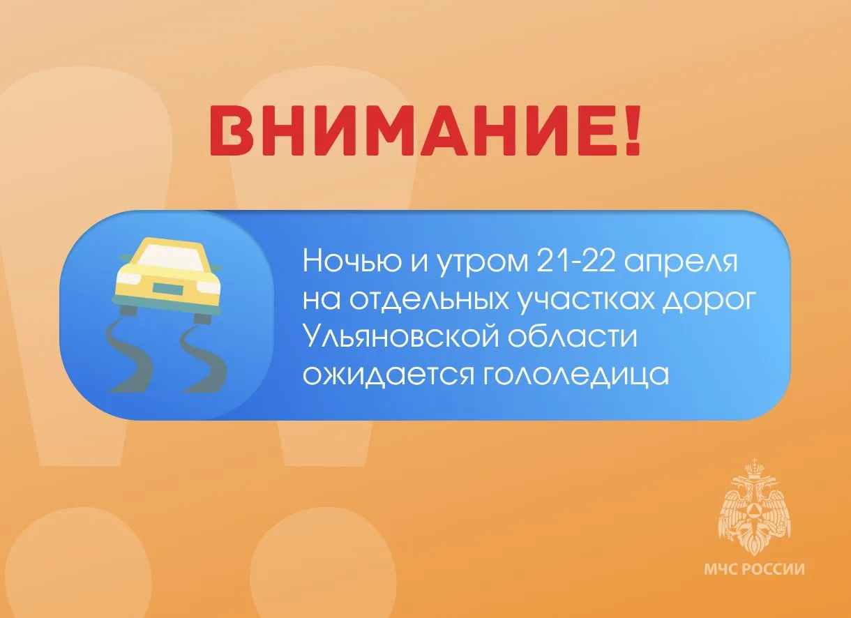 Ночью и утром 21-22 апреля на отдельных участках дорог Ульяновской области ожидается гололедица.