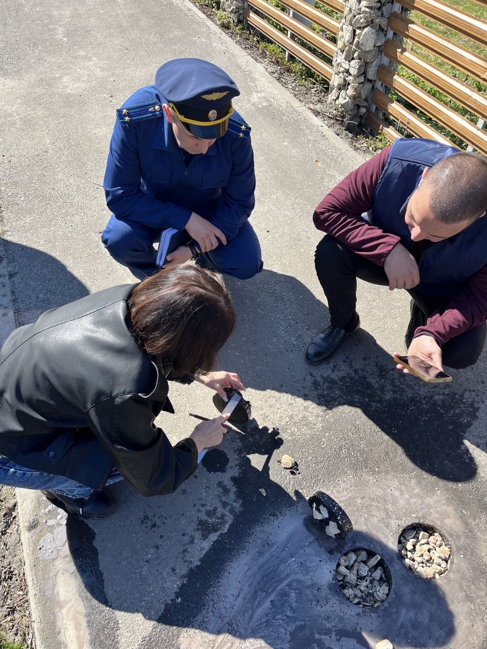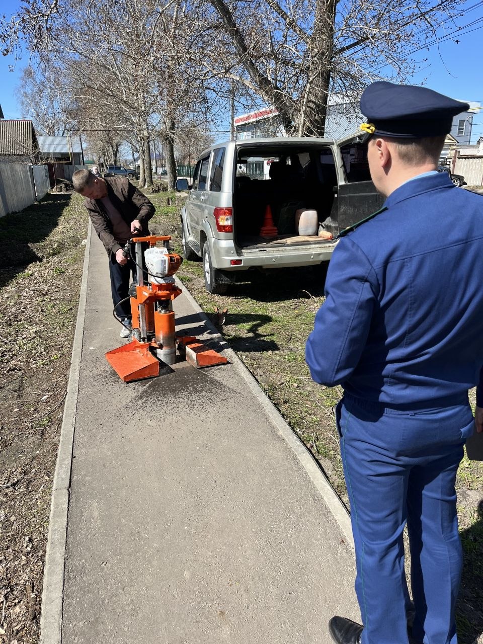 В ходе выездов заместитель прокурора района Боляев А.А. оценивает качество ремонта пешеходных дорожек на улицах Ленина и Школьной в р.п. Ишеевка.