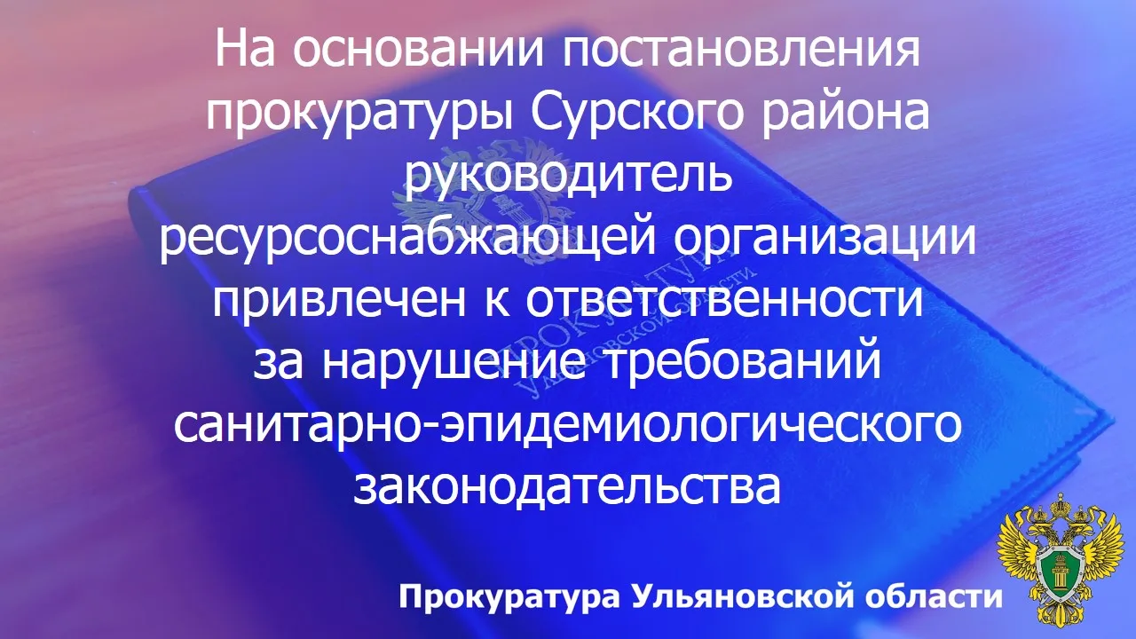 По результатам рассмотрения возбужденного прокурором Сурского района Ульяновской области дела об административном правонарушении по ч. 1 ст. 6.3 КоАП РФ (нарушение законодательства в области обеспечения санитарно-эпидемиологического благополучия населения) директор МУП «Родник» подвергнут наказанию в виде штрафа.