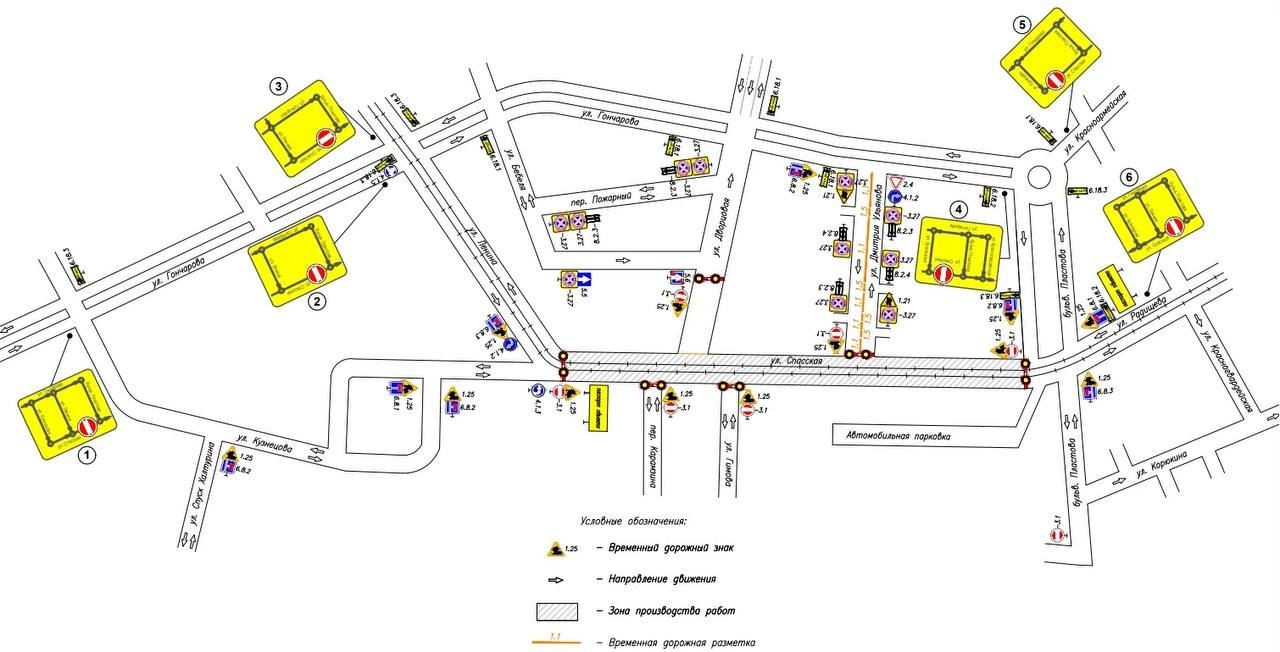 Участок Спасской между Ленина и бульваром Пластова полностью закроют для автомобилей. Для увеличения пропускной способности отрегулируют светофоры на улице Гончарова.