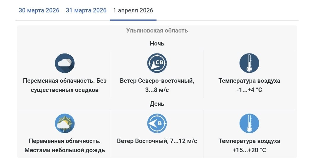 Ветер будет дуть северо-восточный, со скоростью от трех до 11 метров в секунду. Температура воздуха днем по региону от +11°С до +16°С, местами - до +21°С! В Ульяновске воздух прогреется до +13°С.Опасные и неблагоприятные метеорологические явления...