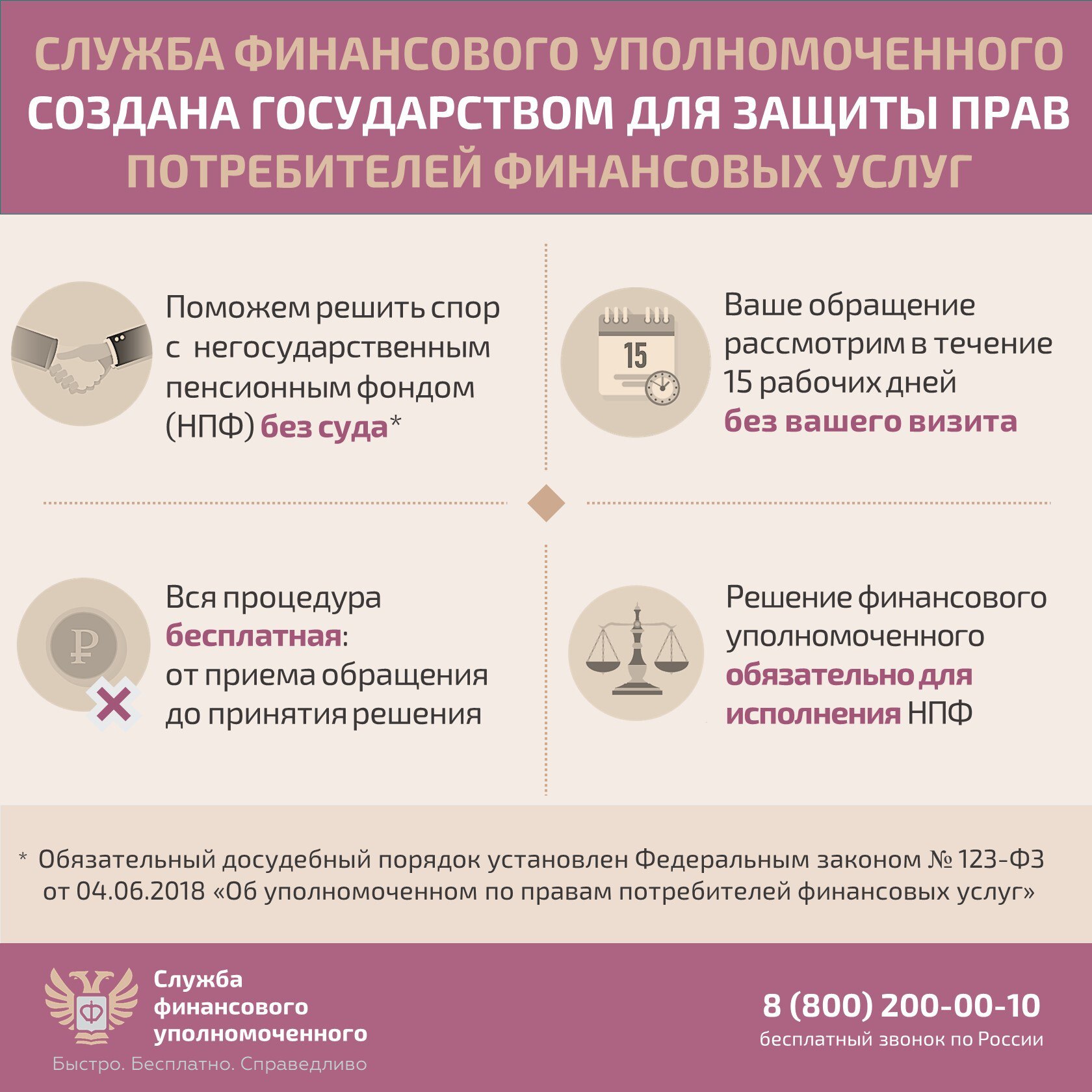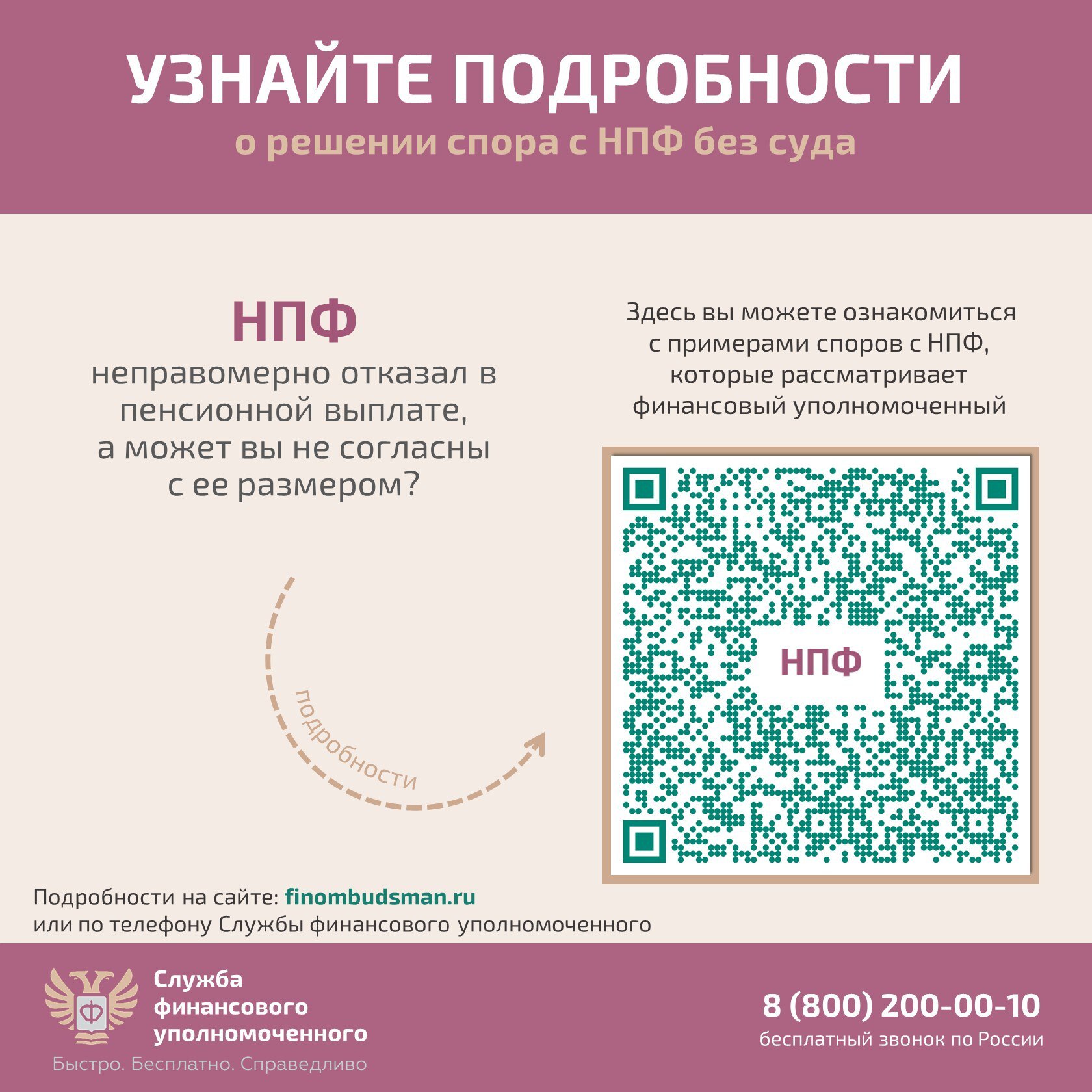 Финансовый уполномоченный по Закону* поможет вам абсолютно бесплатно, если НПФ отказался удовлетворить ваши требования по пенсионным выплатам, возникшие в рамках договоров об обязательном пенсионном страховании (ОПС), негосударственного пенсионного обеспечения (НПО), досрочного негосударственного пенсионного обеспечения (ДНПО), например, если вы не согласны: