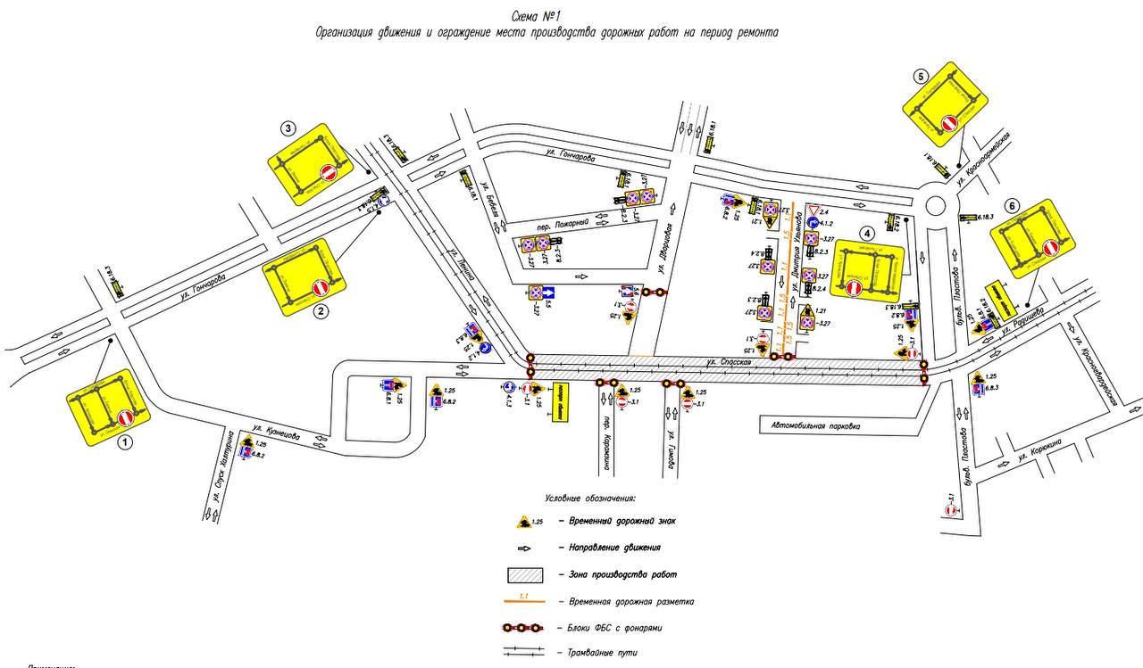 В связи с проведением ремонта вводится ограничение движения на участке улицы Спасской (от бульвара Пластова до улицы Ленина) с 10:00 1 апреля до полуночи 10 июня, а также с полуночи 10 июля до 22:00 25 августа