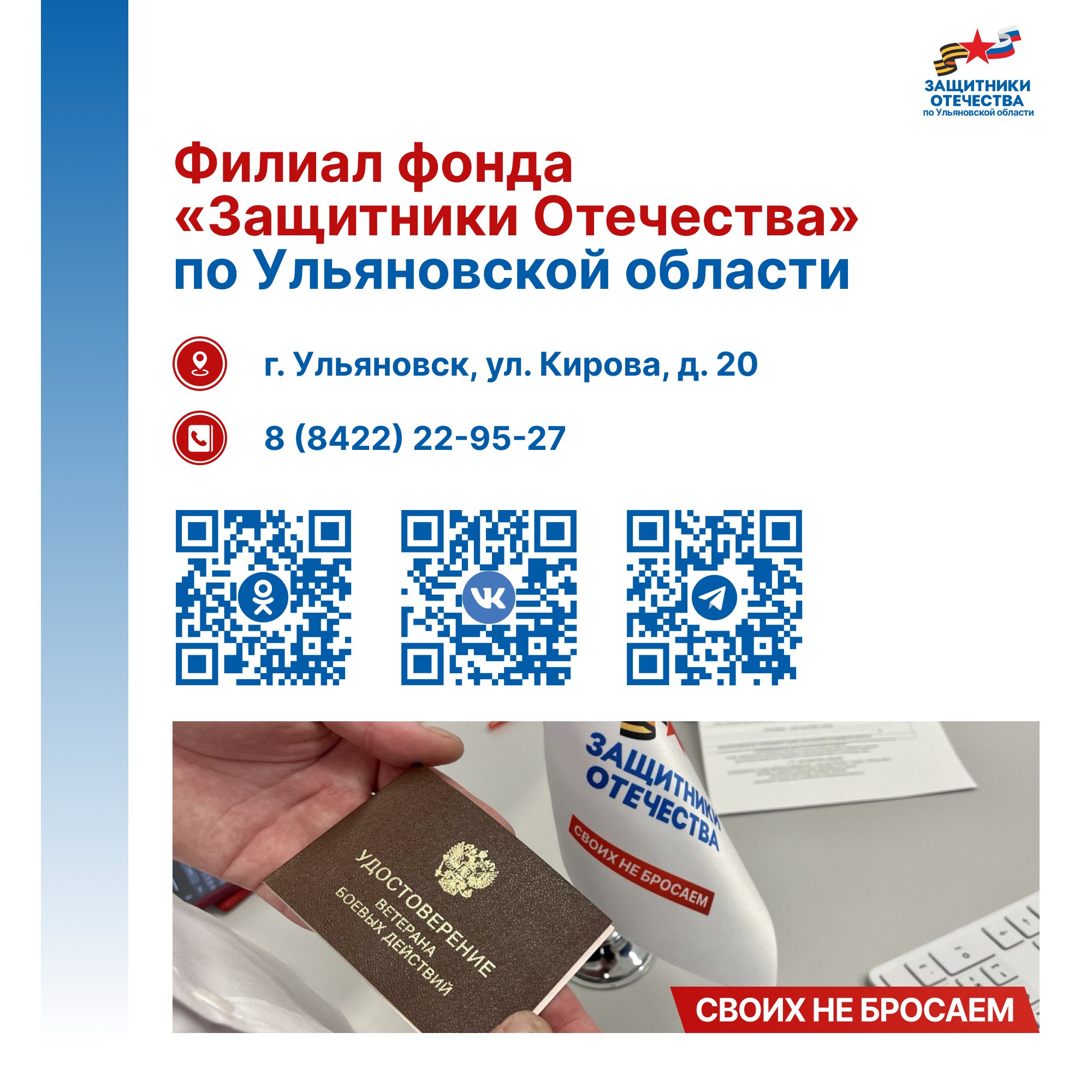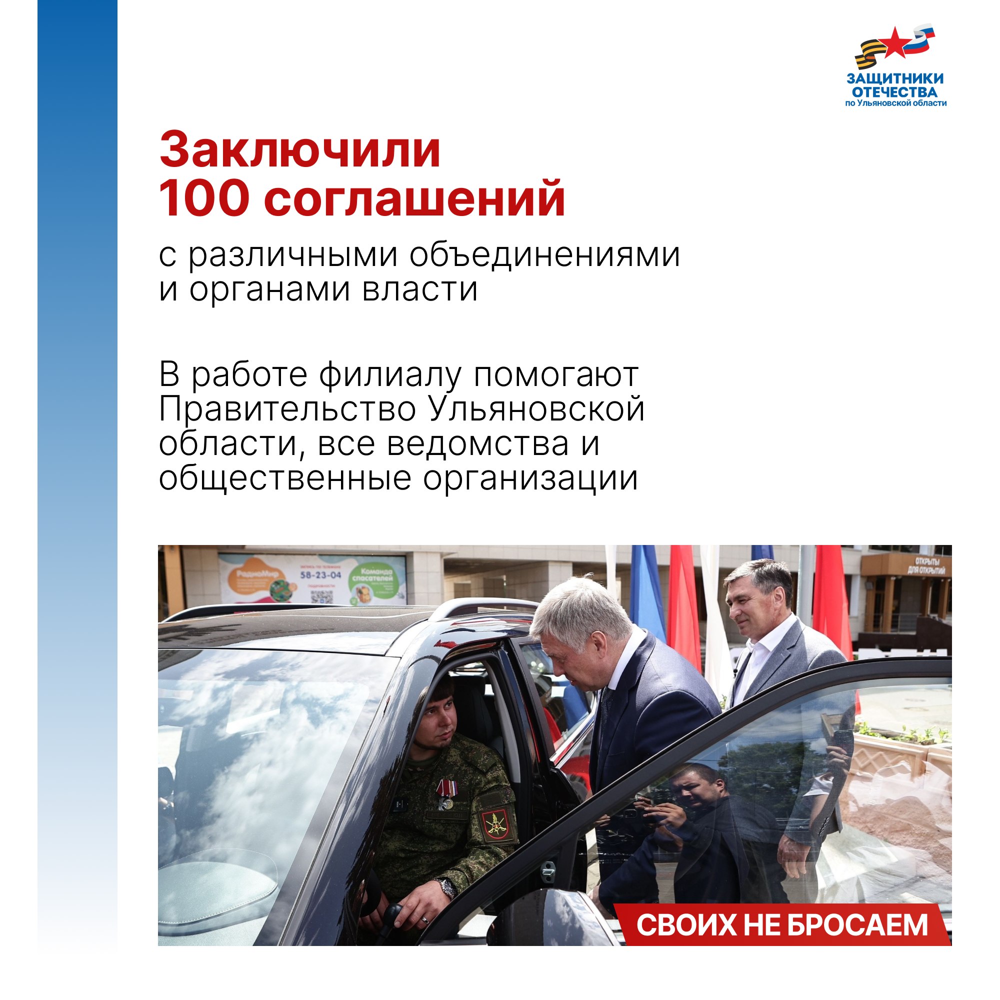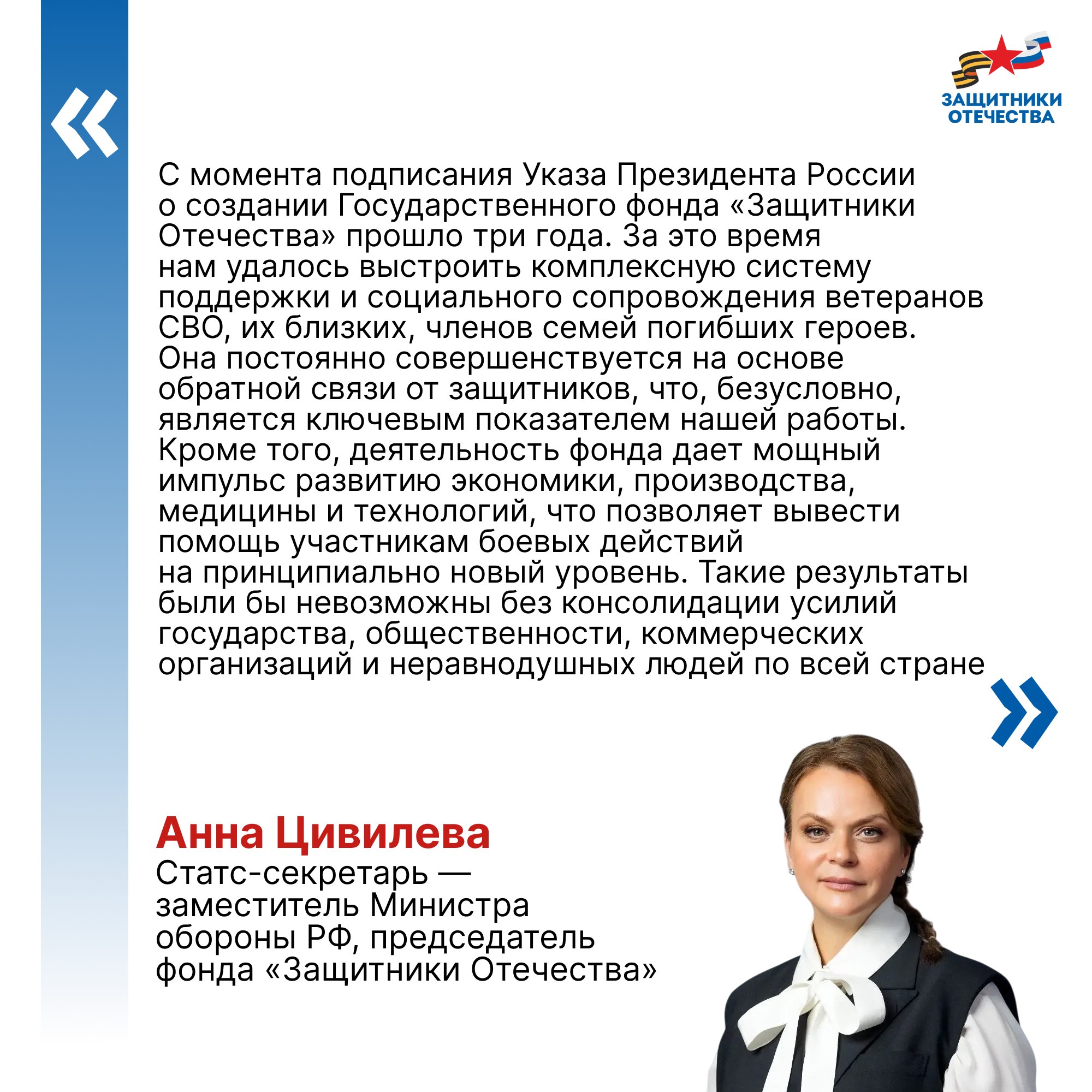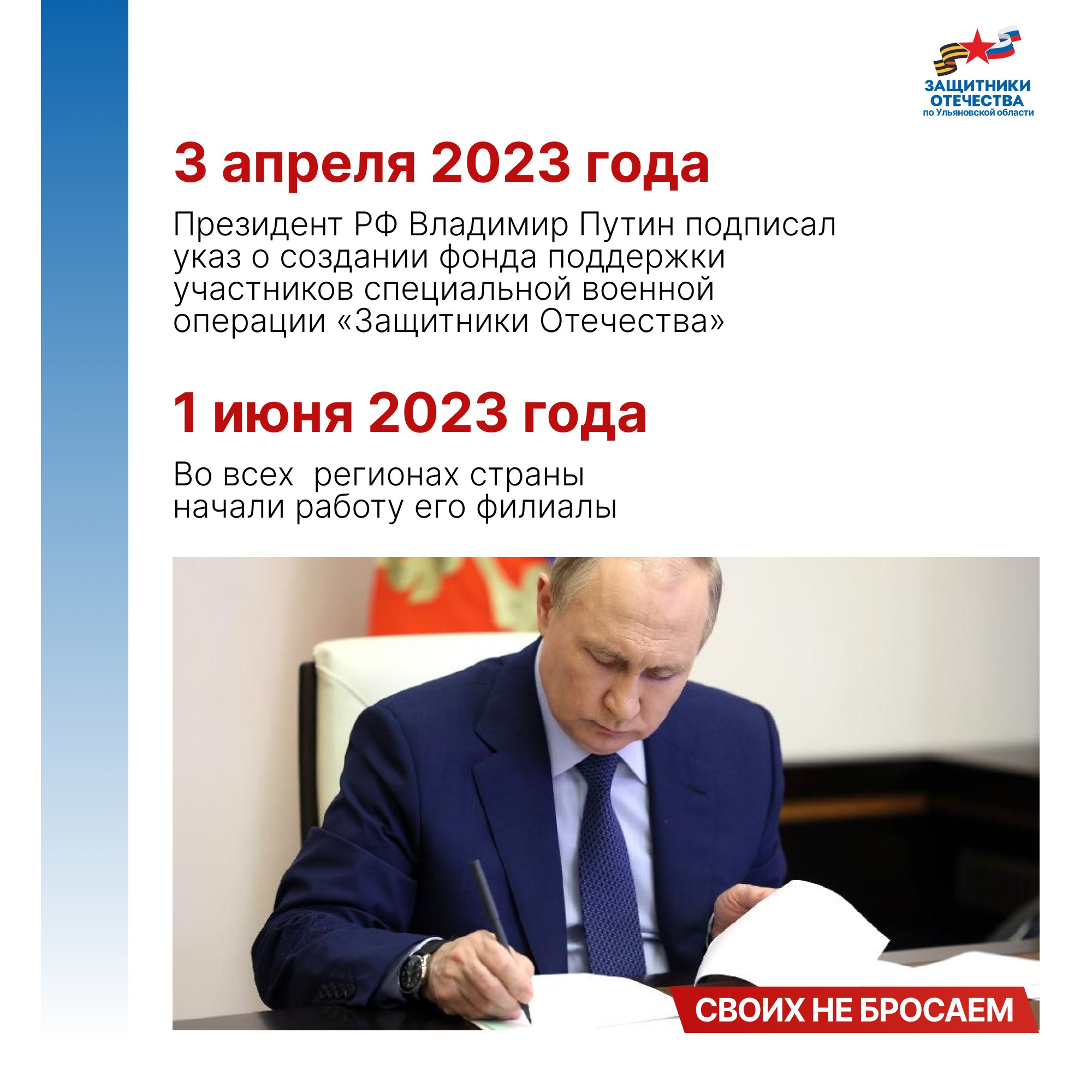 Владимир Путин подписал указ о создании фонда поддержки участников СВО «Защитники Отечества» 3 апреля 2023 года. Председателем фонда стала заместитель Министра обороны РФ, председатель фонда «Защитники Отечества» Анна Цивилева. 1 июня во всех 89 регионах страны, включая Ульяновскую область, начали работать его филиалы. Задача фонда - персональное социальное сопровождение ветеранов СВО и семей погибших бойцов.