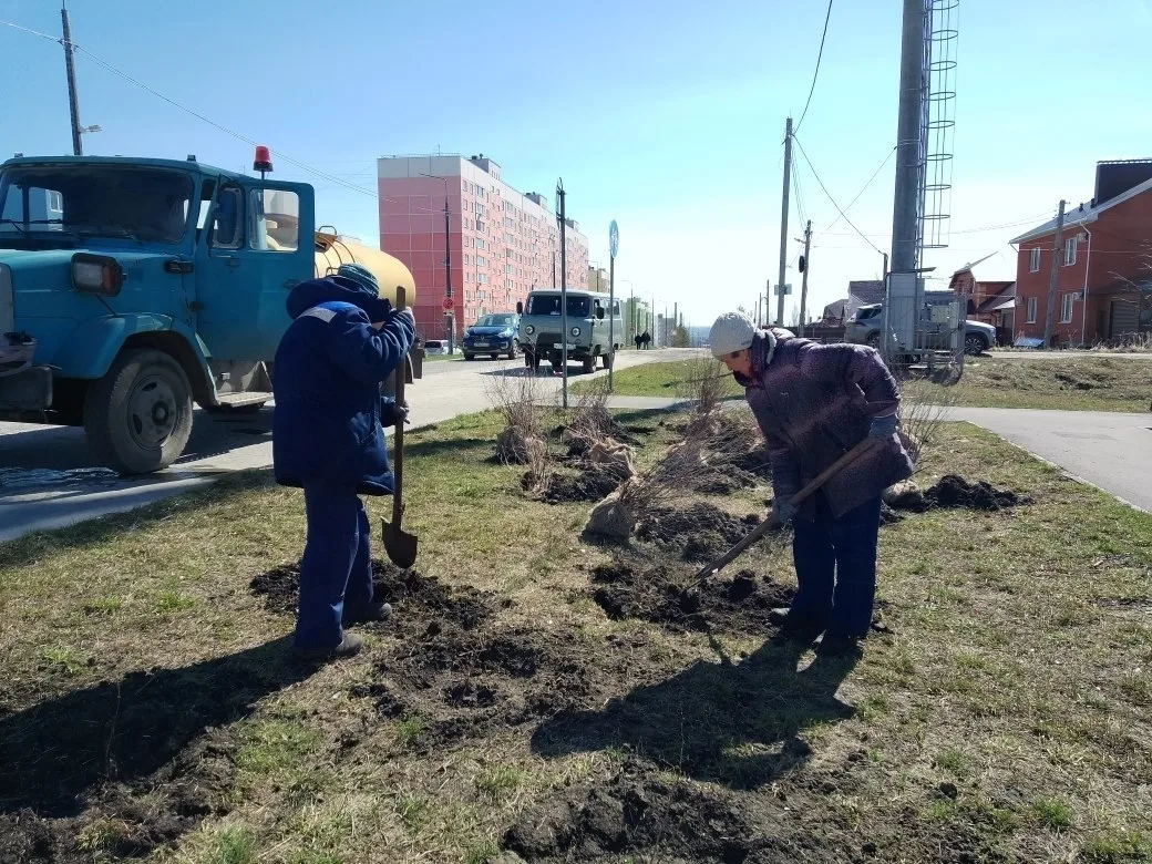 К уже приживившимся рябинам, елям, туям и липам, которыми украсили сквер в предыдущие годы, рабочие высаживают целые группы кустарников — чубушник, сирень и снежноягодник.