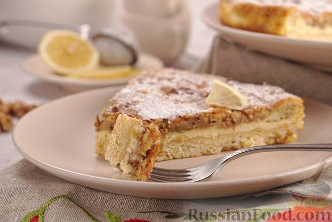 Первый на очереди — песочный пирог, который выделяется своей ореховой корочкой и кремом с лимонным вкусом. Это три слоя удовольствия: основа из теста, лимонный крем и воздушная яичная масса с хрустящими орехами. Такой десерт станет настоящим украшением стола.
