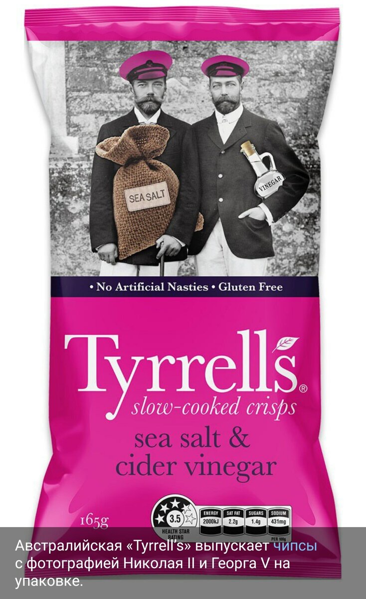 Недавно в интернете появилась интересная находка: упаковка чипсов «Tyrrell’s» с изображением российских царей Николая II и Георга V. Эти чипсы, произведенные в Австралии, предлагают незабываемый вкус, который описывается как сочетание «крепкого сидрового уксуса и тонкой морской соли» – все это делает их настоящим деликатесом.