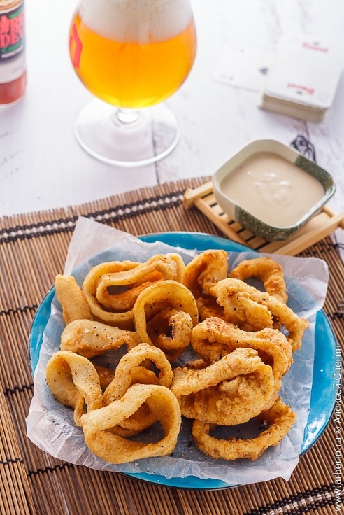 После этого можно приступить к обжарке. Для начала приготовьте панировку: смешайте все ингредиенты и обваляйте в них кальмары. Затем приготовьте двойной кляр, который даст еще больший объем и хрустящую корочку. Обмакивайте кольца сначала в кляр, затем обваляйте в панировке и жарьте в предварительно разогретом масле до золотистой корочки.