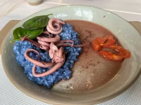 - Синее ризотто с командорскими кальмарами.