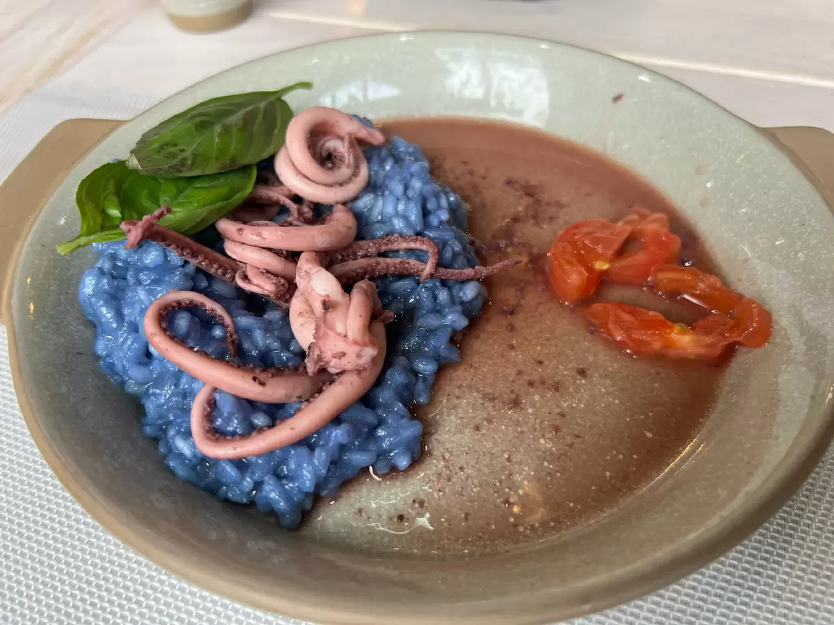 Каждое блюдо создано с любовью и вниманием к деталям, что делает обед не только вкусным, но и красивым. Особенно выделяется синее ризотто, которое гармонично сочетает в себе насыщенные вкусы морепродуктов.