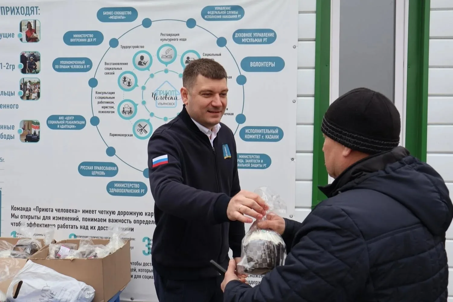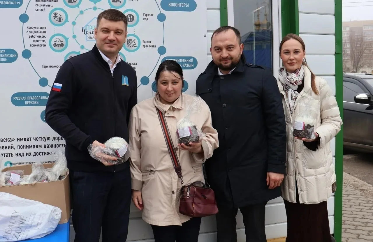 В канун праздника председатель Ульяновской Городской Думы Илья Ножечкин, депутат Городской Думы Полина Гонашилина и руководитель проекта «Приют человека» в Ульяновске Айрат Сафин раздали куличи в пункте выдачи горячей еды на Шолмова, 20.