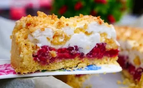 Белки со щепоткой соли и сахаром взбиваются до устойчивых пиков. Шапку наносят слоями между ягодами и тестом, затем отправляют пирог в духовку ещё на 5–10 минут. Готовая поверхность должна стать золотистой и ароматной.