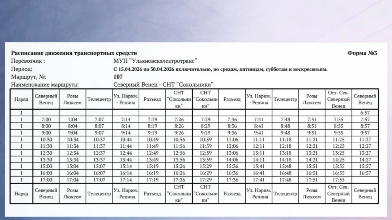 С 15 апреля до 1 мая по маршруту «Северный Венец» — СНТ «Сокольники» будет ходить один вагон с интервалом в 1 час по средам, пятницам, субботам и воскресеньям.
