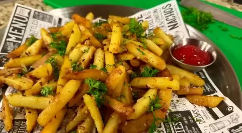 Заключительный акцент — посолите картошку в конце, чтобы корочка осталась хрустящей. Вместо обычной соли можно использовать копченую паприку для дополнительного вкуса и аромата. Перед подачей украсьте свежей петрушкой и, конечно же, не забудьте о кетчупе для настоящего наслаждения!
