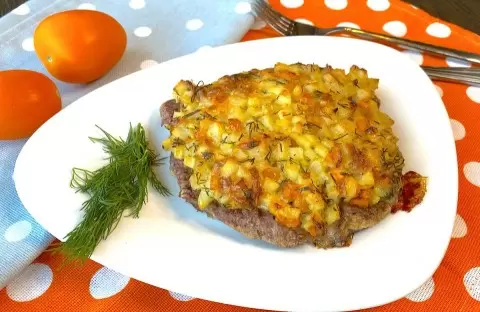 Получившуюся массу равномерно распределите поверх мяса. Закройте блюдо фольгой и отправьте его в предварительно разогретую до 190 градусов духовку на один час. За 15 минут до готовности не забудьте снять фольгу, чтобы верх подрумянился и стал аппетитно золотистым.