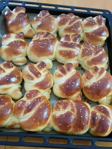 Смешайте все ингредиенты в одной посуде, замесите тесто и оставьте его в теплом месте для подъема. После того как тесто увеличится в объеме, сформируйте из него булочки и дайте им отдохнуть ещё 20 минут. Это обеспечит им объем и легкость.