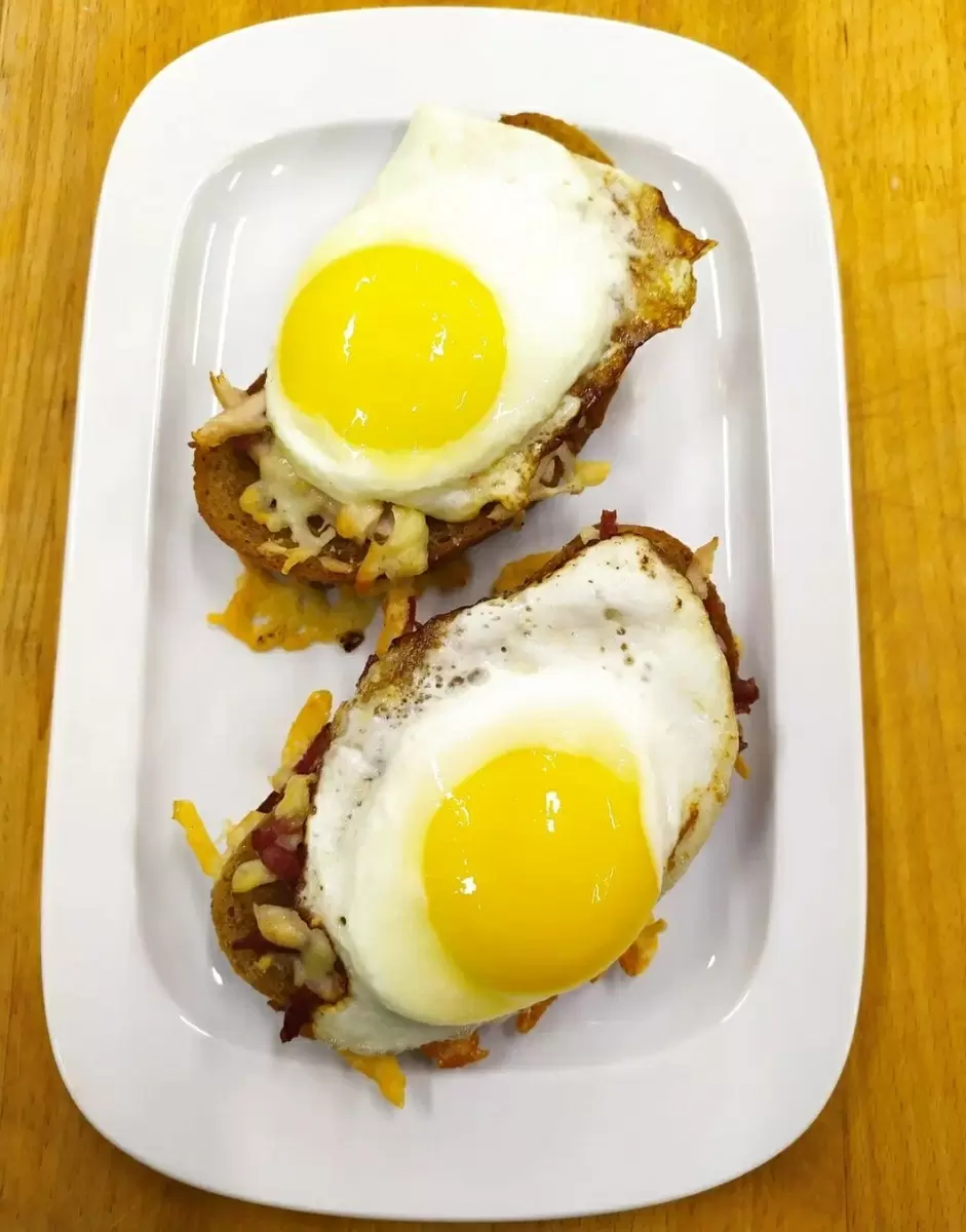 Процесс приготовления прост и увлекателен. Сыр следует натереть на крупной терке, ветчину нарезать соломкой, а затем смешать эти ингредиенты. Полученную массу выложить на ломтики хлеба и запечь в разогретой до 200°C духовке в течение 5-7 минут. Пока бутерброды подрумяниваются, на сковороде можно пожарить яйца, посолив и поперчив их по вкусу. Как только хлеб подрумянится, яйца выкладывают сверху и подают горячими.