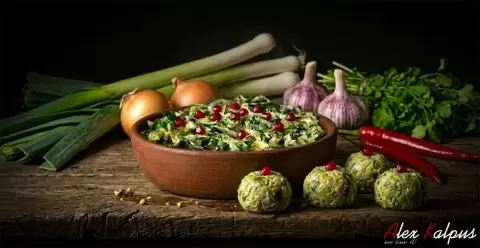 3. Ореховая заправка: В глубокой миске объедините нарезанный лук с орехами, чесноком и свежей кинзой. Приправьте специями и уксусом, тщательно перемешивая до получения однородной массы.