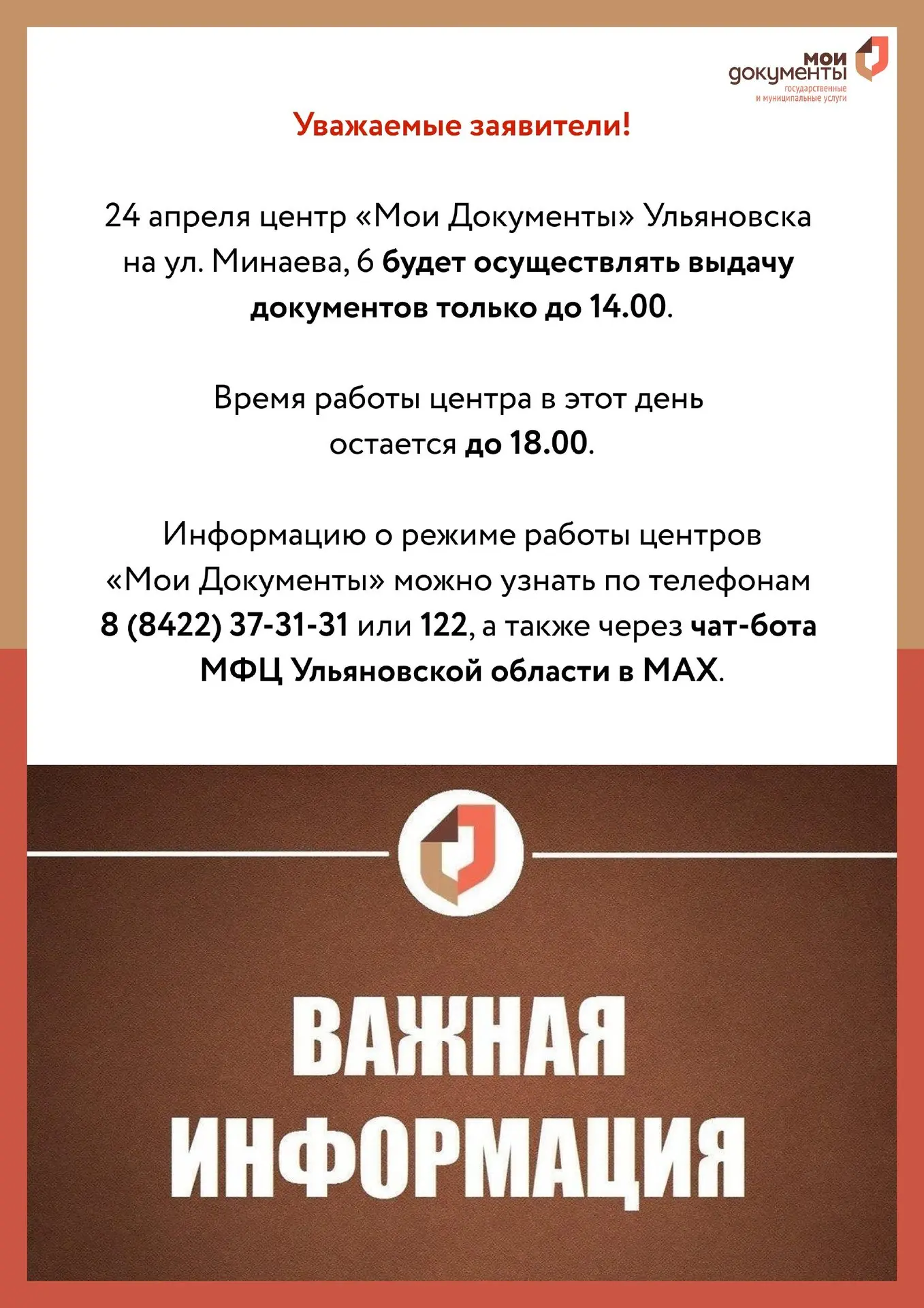 МФЦ на Минаева в Ульяновске 24 апреля выдает документы только до 14 часов