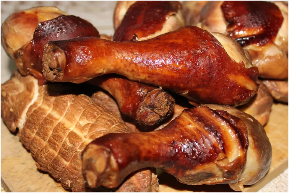 Для копчения рекомендуется использовать щепу из ольхи или бука. Если же таковой нет, подойдут любые плодово-ягодные деревья. Для достижения красивого цвета добавьте пару столовых ложек сахара в щепу. Примерное время приготовления — 1–1.5 часа в зависимости от размера мяса и погодных условий.