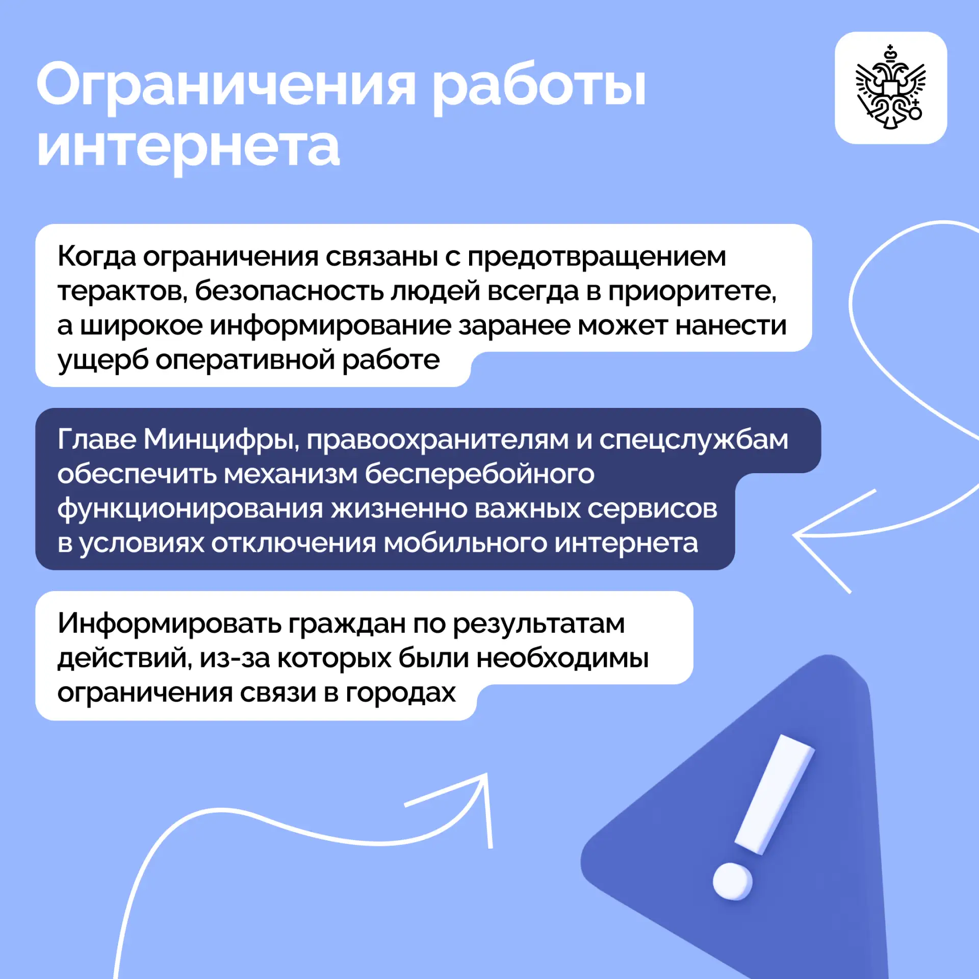 Основной темой обсуждения стало развитие Арктической зоны России и Трансарктического транспортного коридора. Участники также рассмотрели вопросы оказания бесплатной юридической помощи гражданам, обеспечения интернетом малых населенных пунктов от 100 до 1 000 жителей и ограничения работы мобильного интернета в связи с угрозой атак БПЛА в крупных городах страны.
