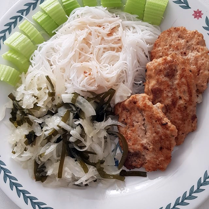 Для гарнира отварить фунчозу и заправить кунжутным маслом. Салат готовится легко: смешать квашеную и морскую капусту с луком и сельдереем, заправить растительным маслом.