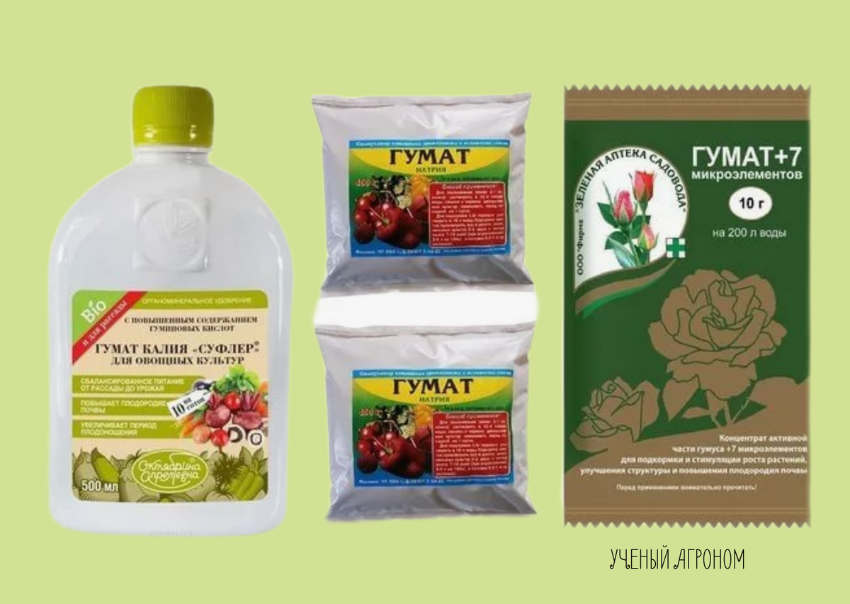 - Гумат натрия — используется преимущественно на кислых и бедных почвах; реже применяется для опрыскивания по листу.