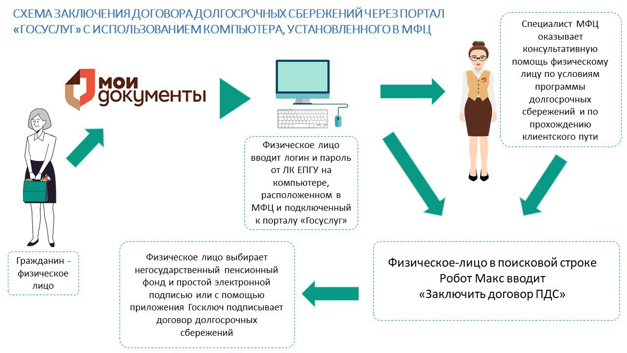 Заключить договор долгосрочных сбережений можно через портал Госуслуг в секторе пользовательского сопровождения МФЦ. Для этого заявителю нужно авторизоваться на портале с использованием логина и пароля от своей учётной записи на Госуслугах. Далее в поисковой строке Робота Макса ввести «Заключить договор ПДС». Затем выбрать негосударственный пенсионный фонд и с помощью электронной подписи или приложения «Госключ» подписать договор. При необходимости консультационную помощь при заключении договора долгосрочных сбережений в электронном виде окажут работники МФЦ.