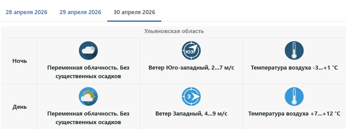 28–29 апреля Ульяновская область будет находится под влиянием ложбины северного циклона. Сохранится холодная погода с порывистым ветром, небольшими осадками смешанного характера.По высотным потокам с северо-запада продолжит поступать холодный воздух, что обеспечит невысокие дневные температуры.